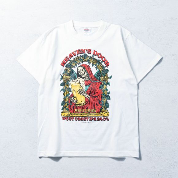 今回のTシャツは、けやきひろばビール祭りに向けて醸造したビール【HEAVEN'S DOOR】のイラストを使用。