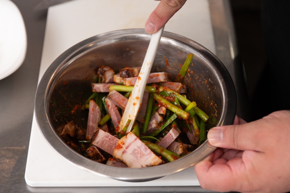 4.チャーシューとキムチ和えの素を和えていきます。