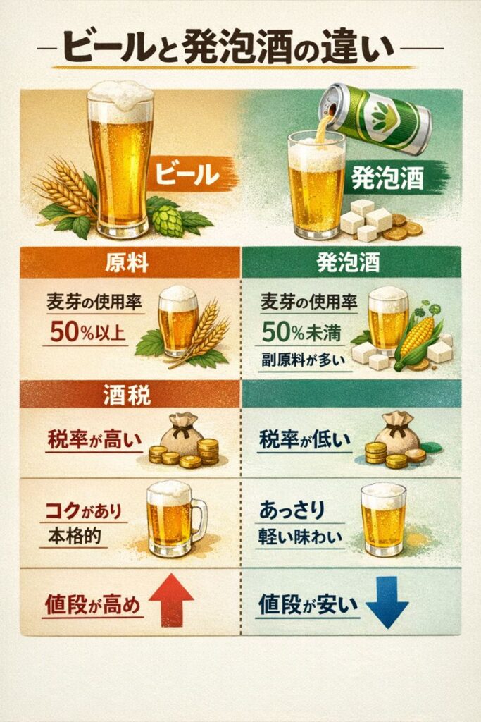 ビールと発泡酒は「見た目が似ている炭酸の麦のお酒」という共通点がある一方で、法律上の定義、原料の配合、味わい、そして価格に影響する酒税の扱いが異なります。